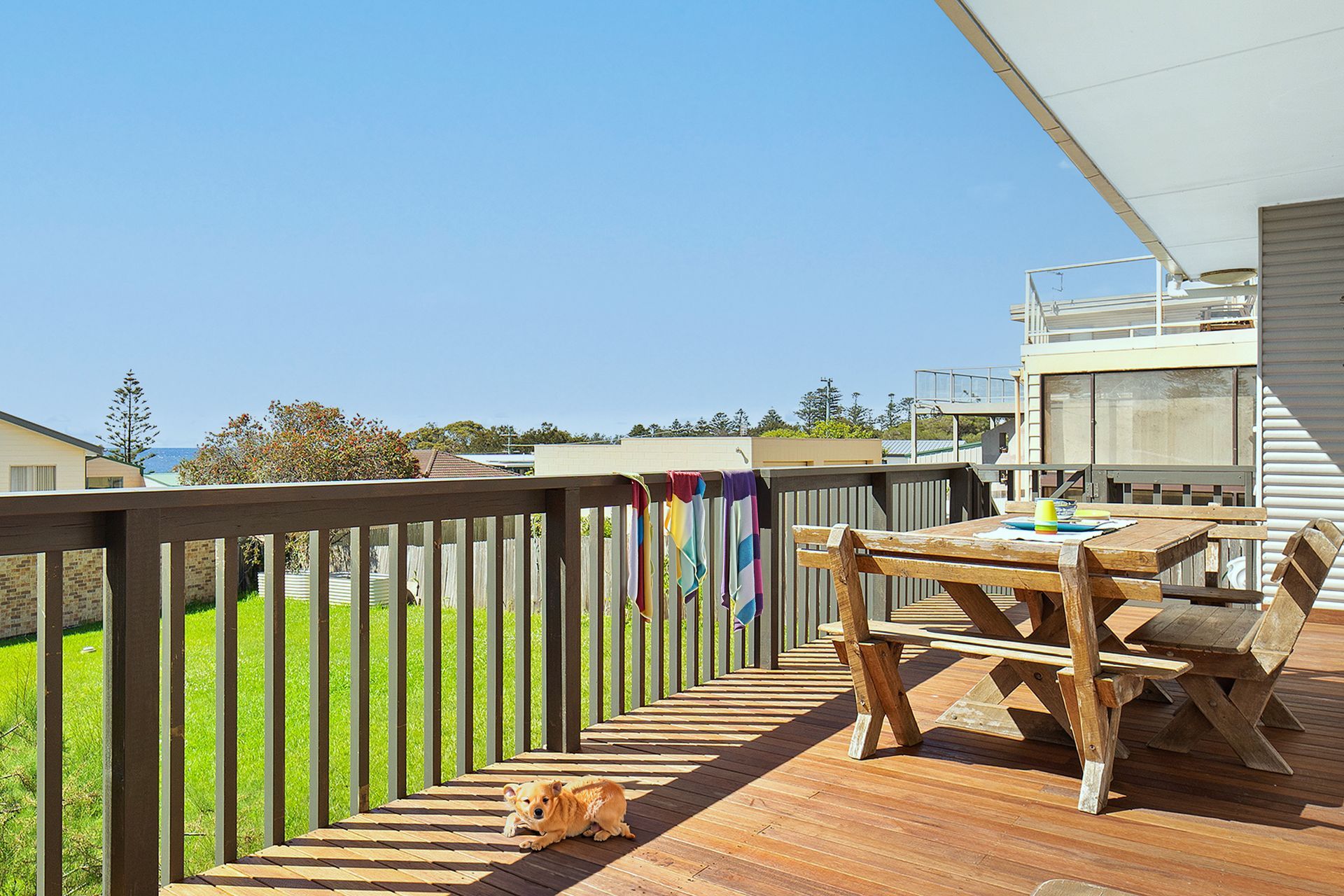Comprising two bedrooms (one queen bed & one double bed with single bunk bed above), bathroom with feature tub, kitchen, open plan living area & laundry. The well-equipped kitchen retains its original rustic charm, and has all the cooking and serving equipment needed for family dinners or gourmet feasts. A Weber BBQ is provided to enjoy barbeques with a view from the back deck! The sun drenched living space with timber flooring enjoys an ocean view & features a wide screen television, with HDMI-cable and DVD player. There is also a wide selection of family board games and videos in the TV console. A wide selection of books is also provided for your enjoyment. Your well-behaved pet is welcome with prior approval. The deck is securely gated & the back garden is fully fenced. The back deck provides an ideal spot to bask in the morning sun whist planning your day or to fire up the barbecue & enjoy an outdoor meal. All bed linen, bath towels & free Wifi are standard inclusions. Reverse cycle heating & cooling. Surf Cottage is an ideal holiday retreat for a couple or small family.